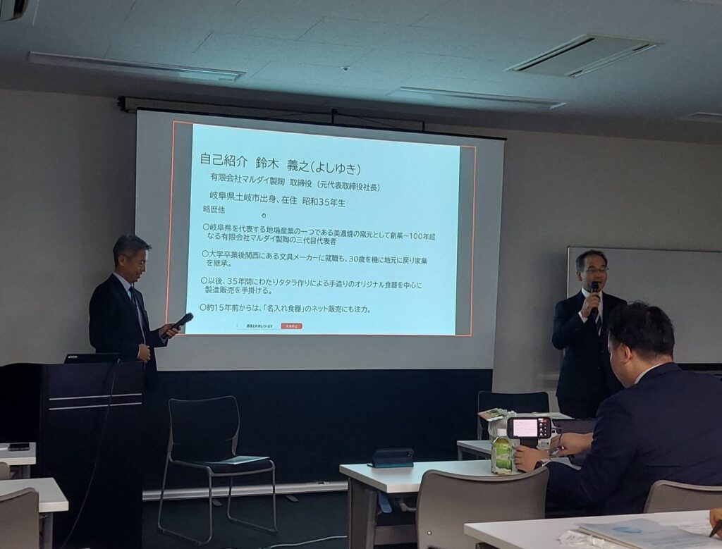 約30名の会場及びオンライン参加者のもと、当センターの小澤サブマネージャーが「小規模事業者のM&Aの新たな形」をテーマに支援事例について、今夏に第三者承継(M&A)実施した「有限会社マルダイ製陶」取締役相談役 鈴木 義之様とトークセッションを行いました。