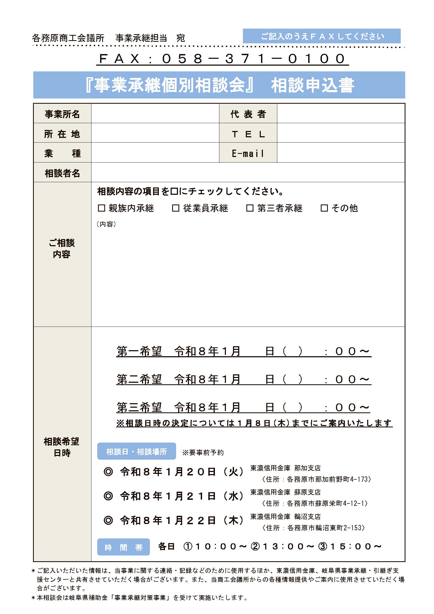 1 FAX 下記相談申込書に必要事項をご記入のうえ、各務原商工会議所へFAX